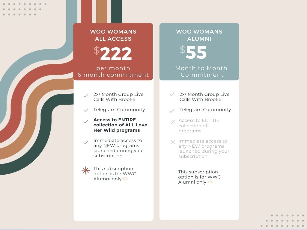 This is for the Woo Woman who is in maintenance mode. She wants to keep her finger on the pulse, stay immersed in the collective high vibe energy, but doesn’t need to be working through any courses right now. (for less than the cost of ONE 1:1 call with Brooke) you get 6 months of: